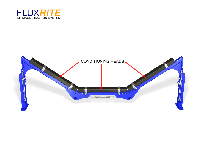 The belt demagnetisation system is designed to reduce strong pockets of magnetic flux that occur in the splices of steel cord conveyor belts. The system comprises of several conditioning heads placed below the carry side of the belt that normalises, then attenuates the magnetic flux. As the magnetised splices pass over the system the demagnetising process takes place reducing the magnetic flux by 95%